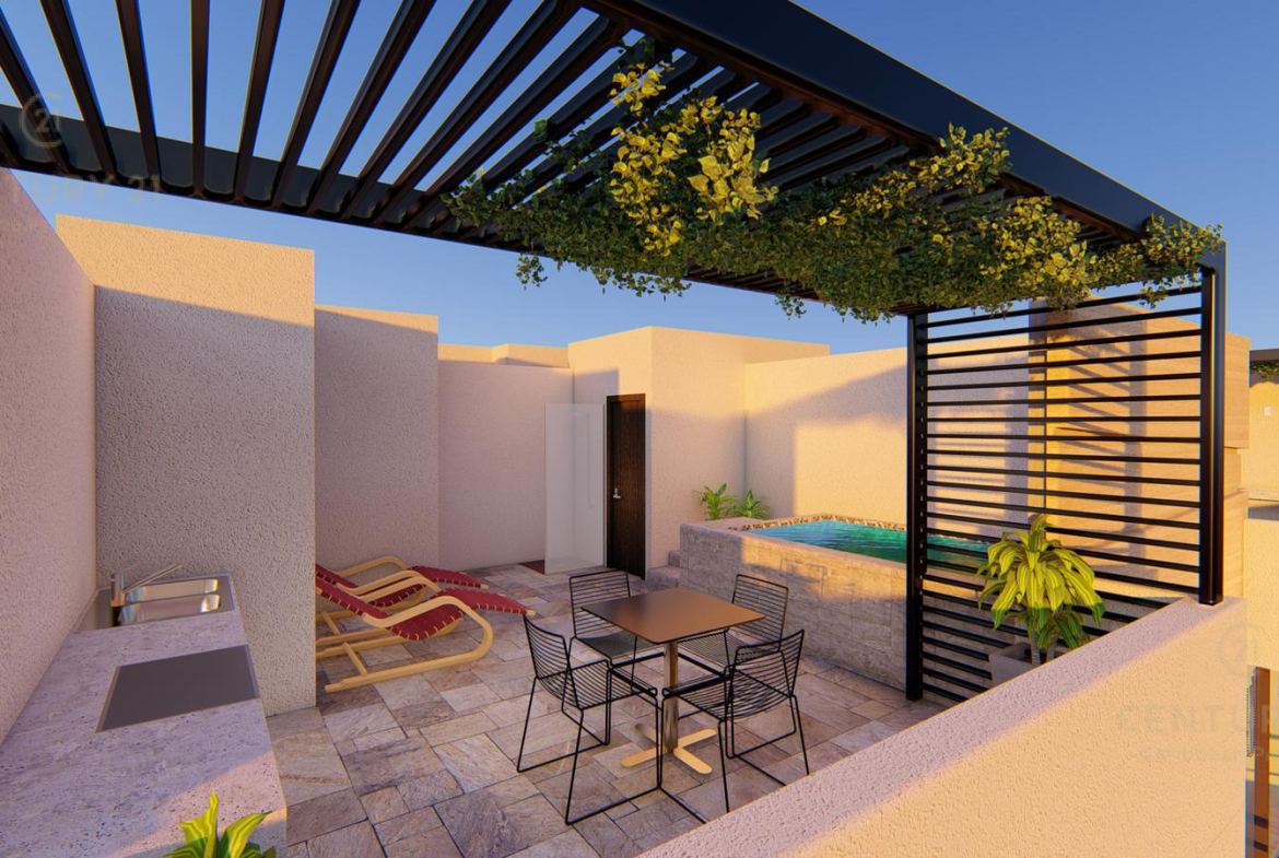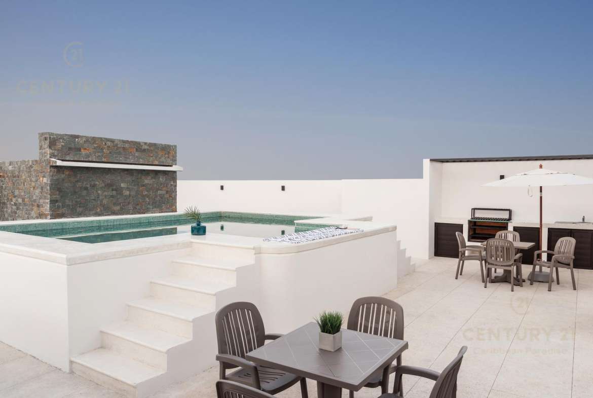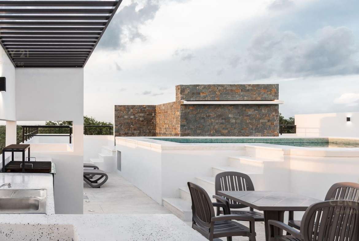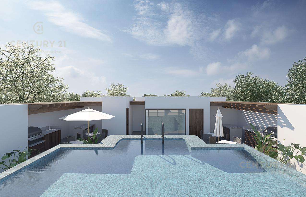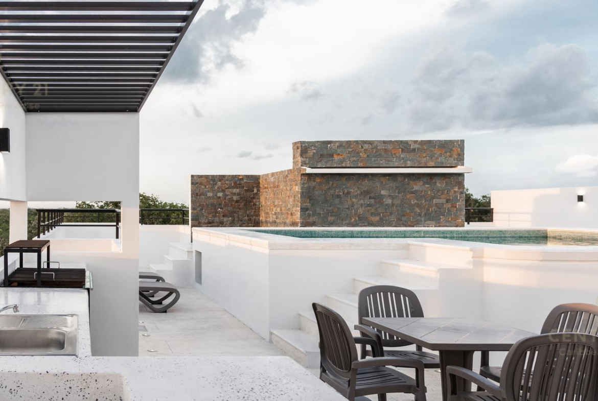 Amenidades como cámaras de seguridad, portón electrico para cochera, roof garden común de 190 mts cuadrados con alberca recreativa, canal de nado, jacuzzi, alberca y área para asadores.
