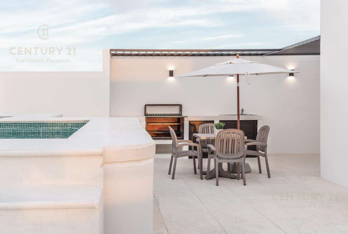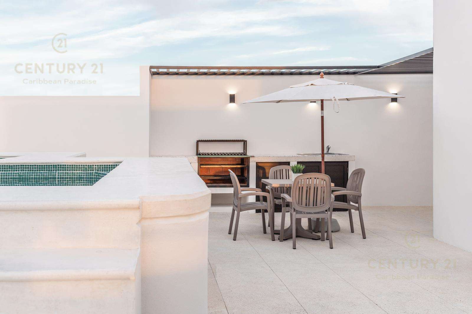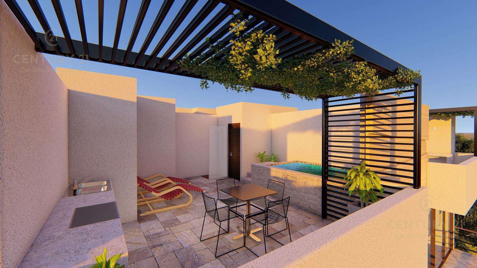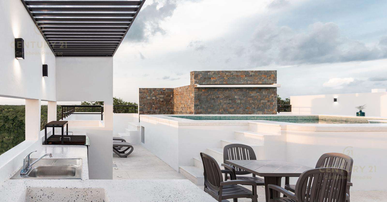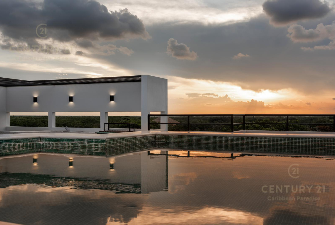 Amenidades como cámaras de seguridad, portón electrico para cochera, roof garden común de 190 mts cuadrados con alberca recreativa, canal de nado, jacuzzi, alberca y área para asadores.