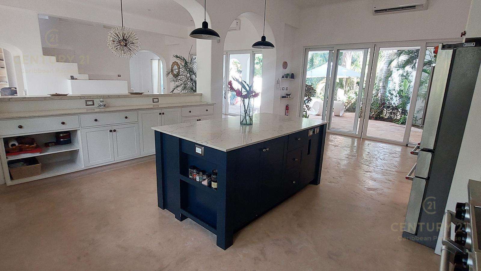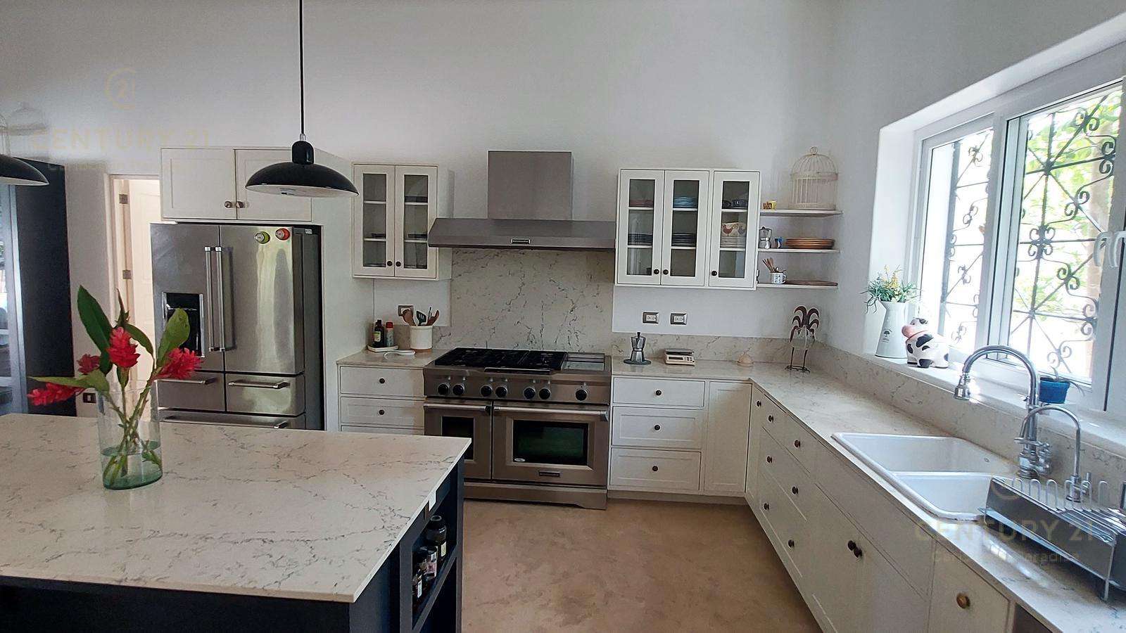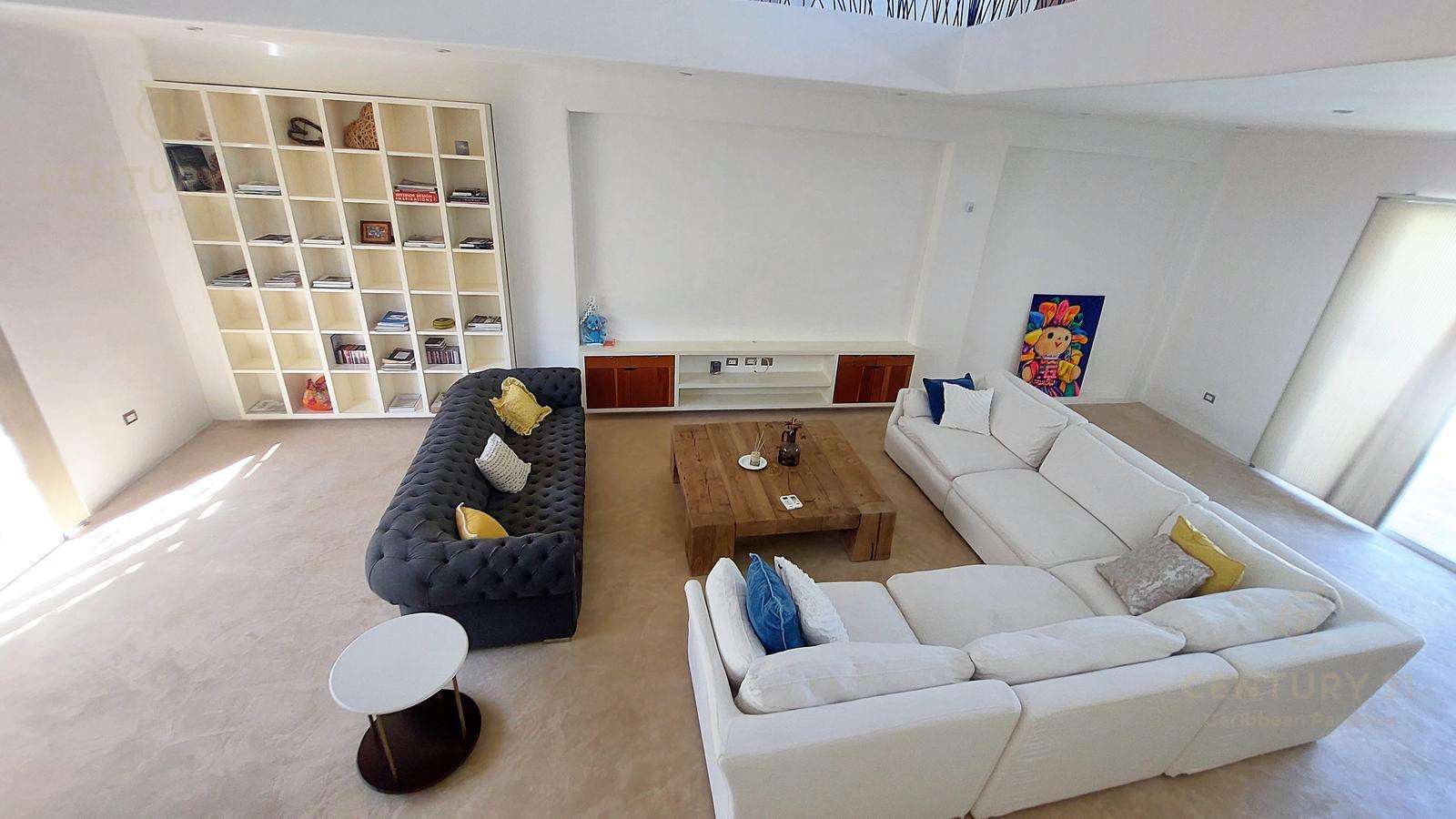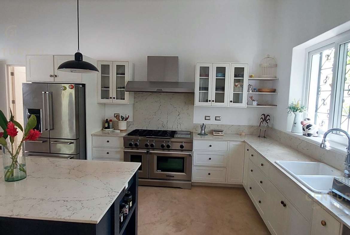 En planta baja aparte de espaciosa terraza de 57 m2 con vista a la alberca y hermoso jardín, tiene una cocina muy grande, sala, comedor biblioteca de 2 niveles, con espacios muy abiertos, techos muy altos y en algunos lados con doble altura.
