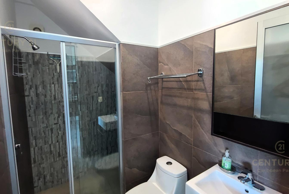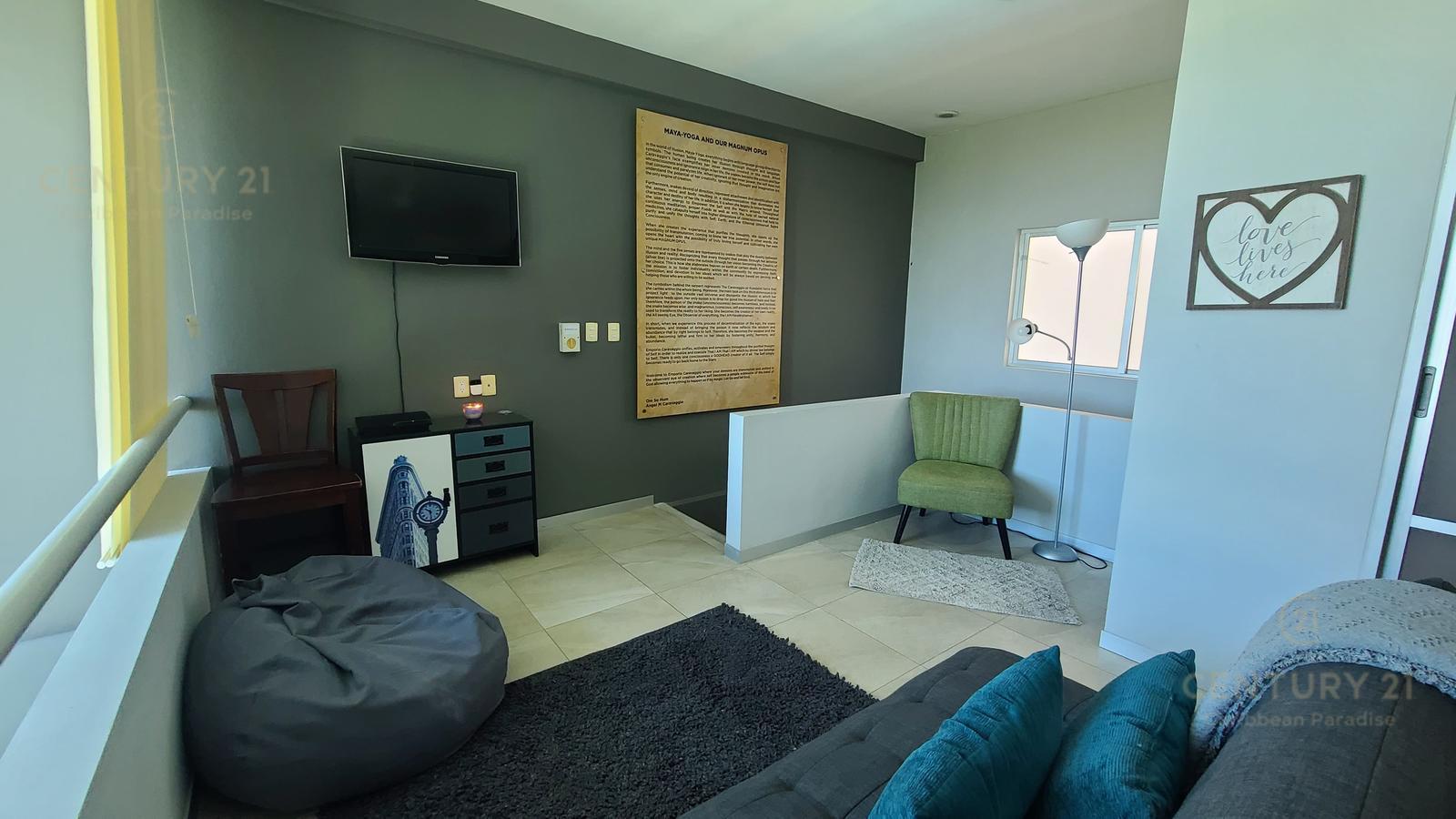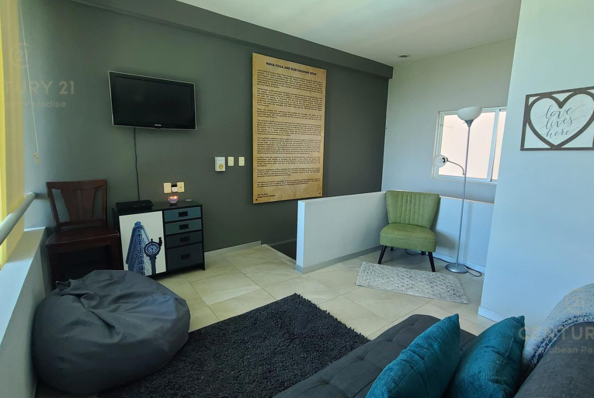 El segundo piso cuenta con apmlia area con sillón, sofa, centro de tv, cama kingsize, closet y baño completo.