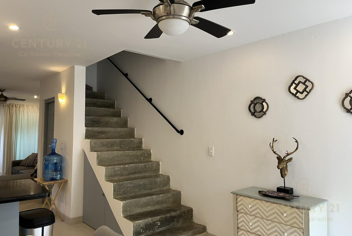 La unidad en planta baja y distribuida en 2 niveles, está ubicada en una zona segura y tranquila, a menos de 5 min. caminando de la famosa playa Mamitas y la 5ª Avenida. Tiene una alberca común con palapa y camastros. Departamento muy acogedor con cocina abierta, sala, estufa eléctrica, refrigerador, TV, micro-onda, 4 ventiladores y 3 A/C (inverter), 3 baños completos, balcón en cada recamara, 1 terraza y acceso directo a la alberca desde la sala (planta baja).