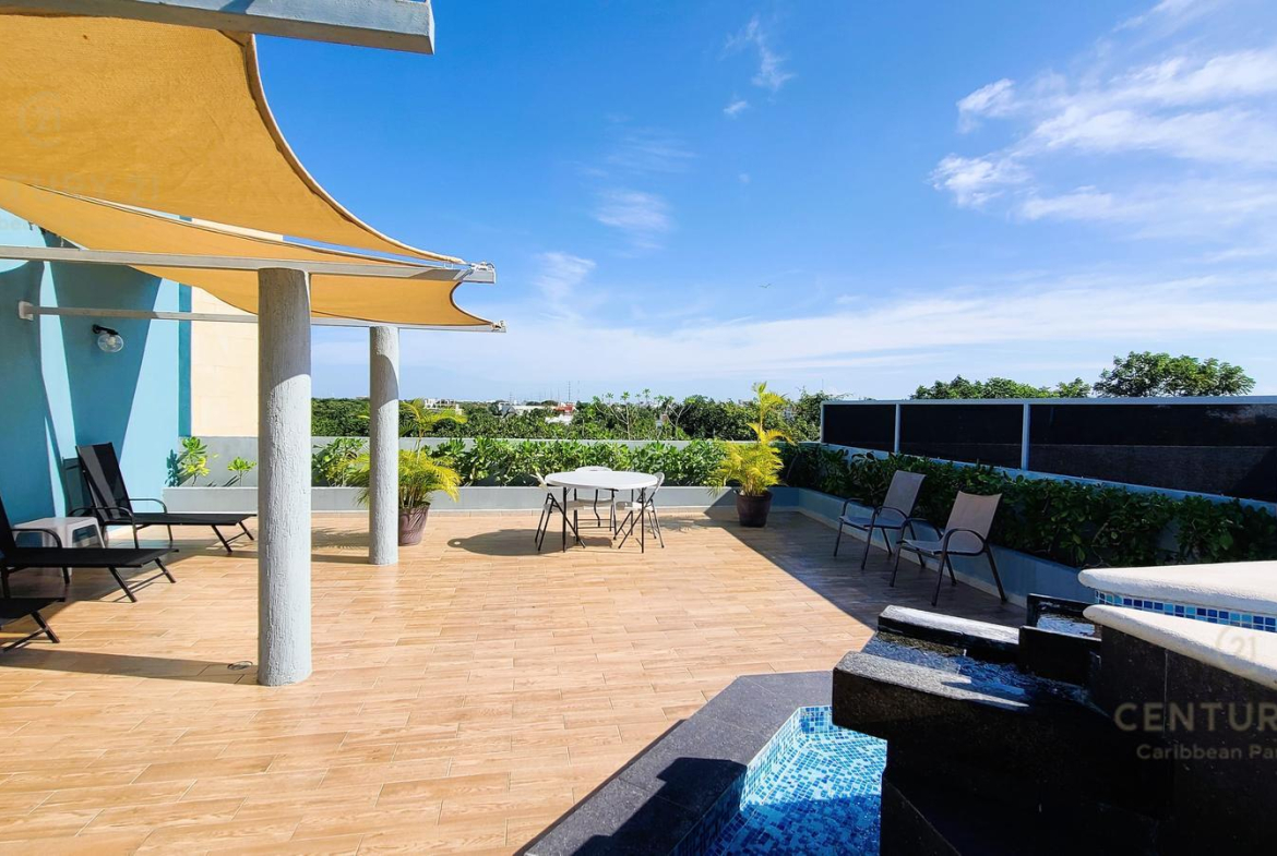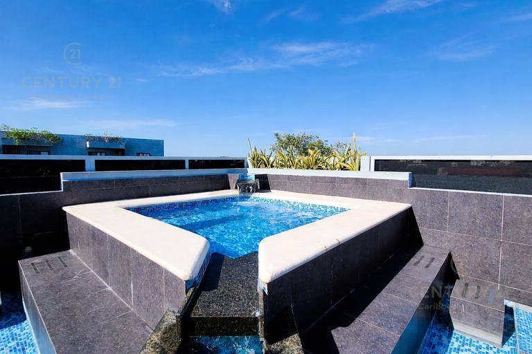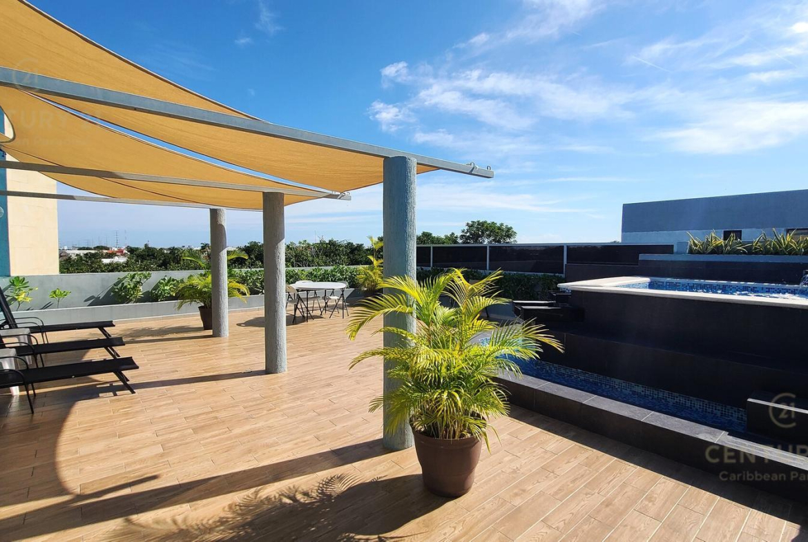 El edificio con areas comunes: lobby con recepcionista, elevador, 2 albercas con jacuzzi y chapoteadero, solarium, zona para convivencia, deck con camastros con sombra.
