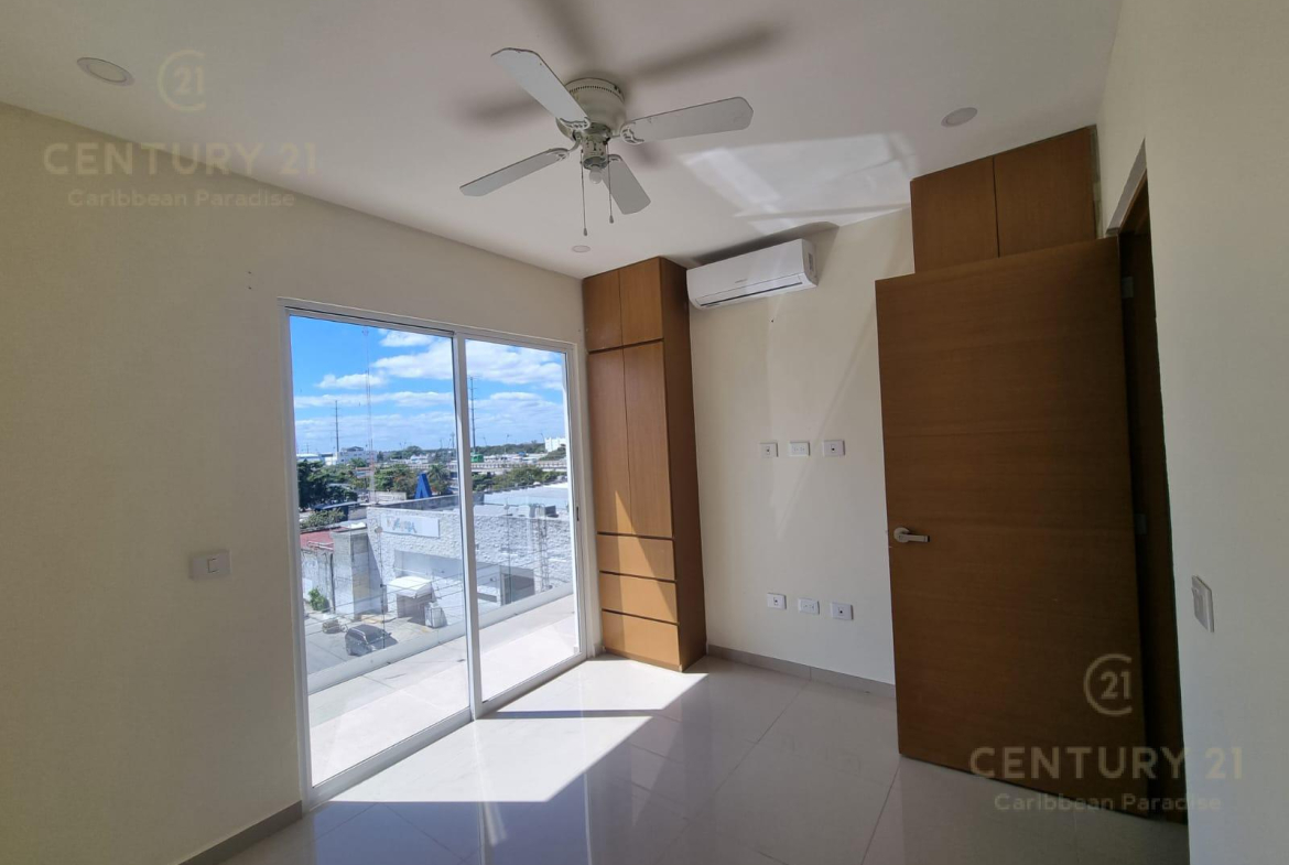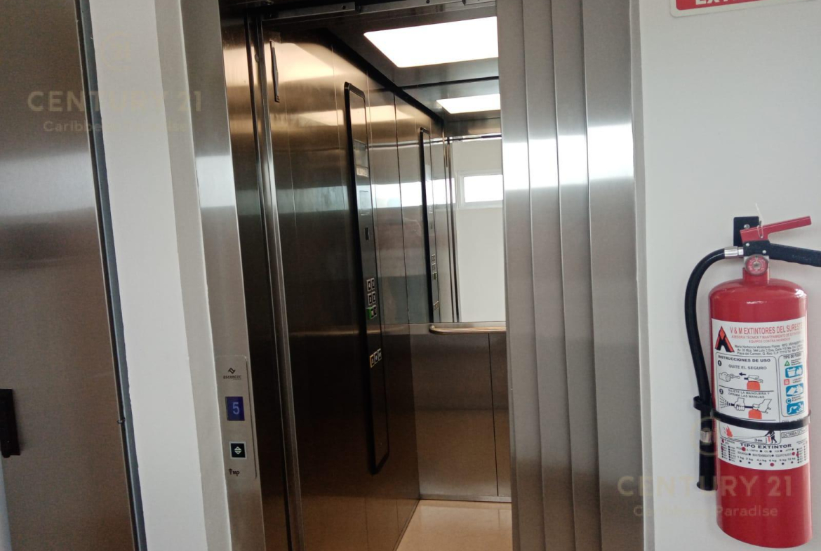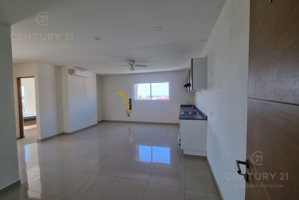 cuenta con cocina equipada , estufa eléctrica de 4 hornillas, lavabo, gabinetes de almacenaje, campana de absorción, aire acondicionado y ventilador, sala comedor, tiene 2 habitaciones equipadas con closets, aire acondicionado cada una y ventilador de techo, un baño completo , puertas de cristal corredizas hacia la terraza, y un espacio para la lavadora.