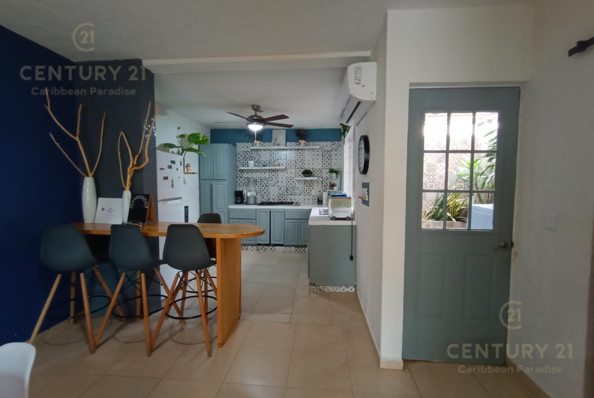 Área de sala con TV, internet infinitum telmex, amplia area de comedor para 8 personas, cocina integral con estufa y barra desayunador, equipada con electrodomésticos, aire acondicionado, baño completo en la planta baja.
