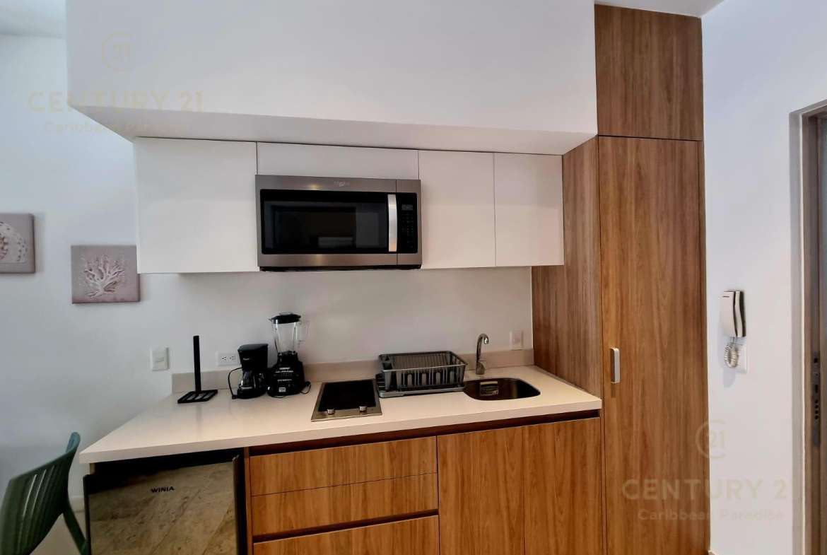 En venta estudio en el Condominio Piedra Azul, totalmente amueblado y equipado cuenta con acabados de lujo como pisos de mármol, cocina de diseño italiano, mesetas de cuarzo, terraza amplia. Se entrega llave en mano, completamente equipado con cocina, clóset, libreros, ventilador, aire acondicionado, sistema hidroneumática y calentador de agua eléctrico