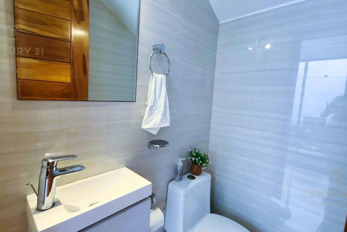 Casa consta en 2 pisos. En la planta baja tiene muy amplia cocina con mini bodega, sala comedor, de buen tamaño y con ventanales alrededor para iluminar la casa, El recibidor u oficina (depende de uso que le quieres dar) y cubo de luz con grande mesa le dan mas amplitud, medio baño.