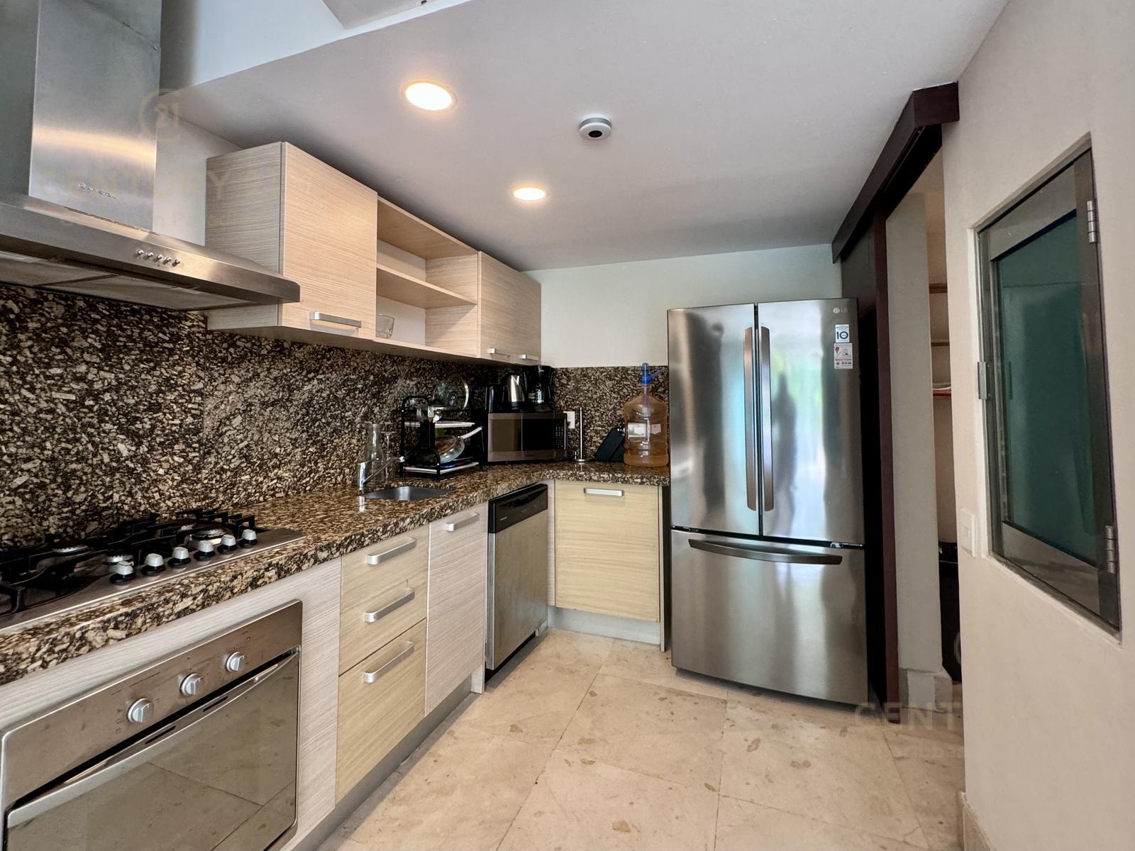 En la planta baja del departamento podrás encontrar una amplia sala, comedor para 6 personas, mueble de bar, cocina integral con parrilla a gas con 6 quemadores, horno, lavavajillas y un refrigerador french door. Además de un área de lavado con centro de lavado. Una amplia master suite que cuenta con baño propio, walkin closet y terraza. La segunda habitación con dos camas, closet, baño y balcón.