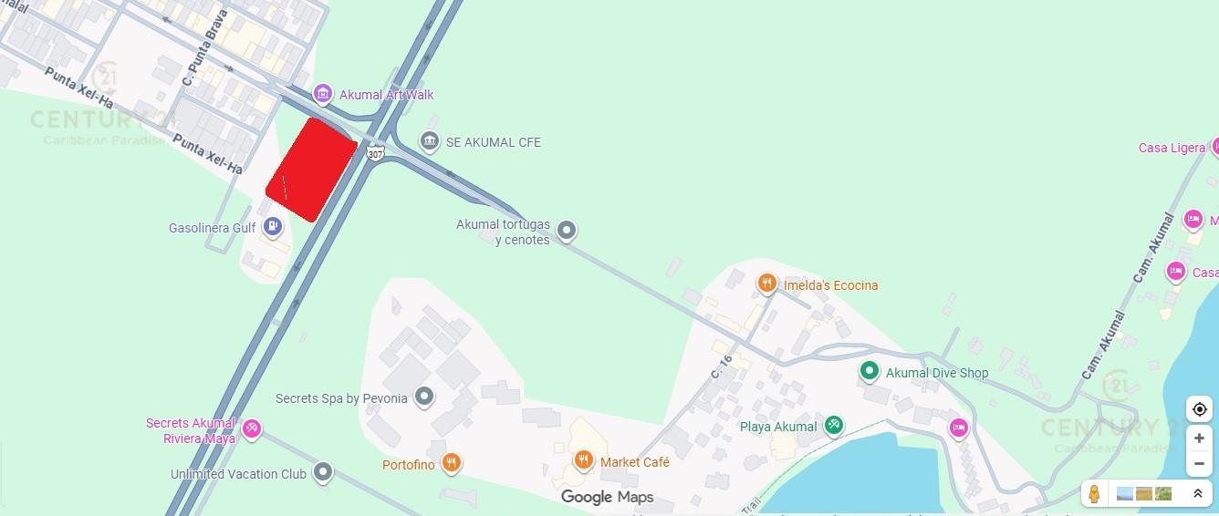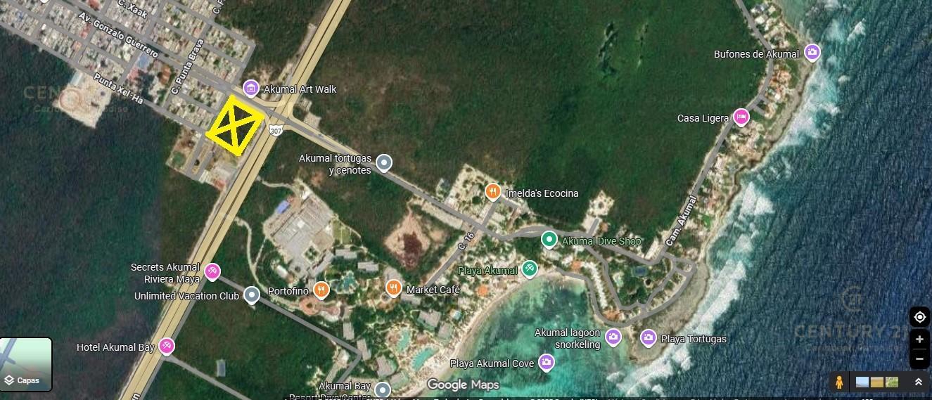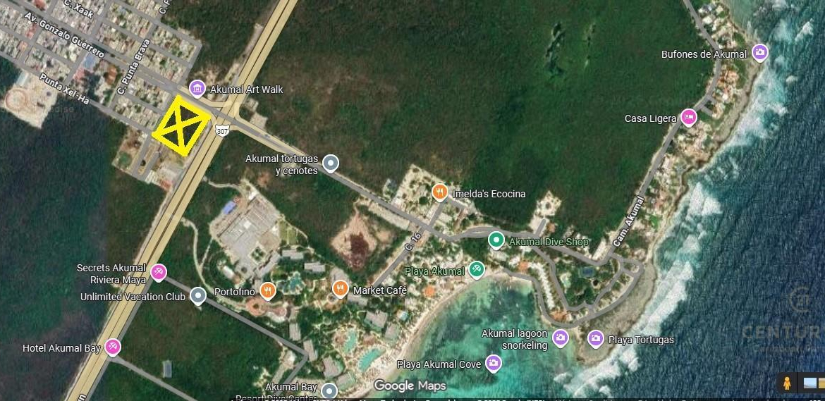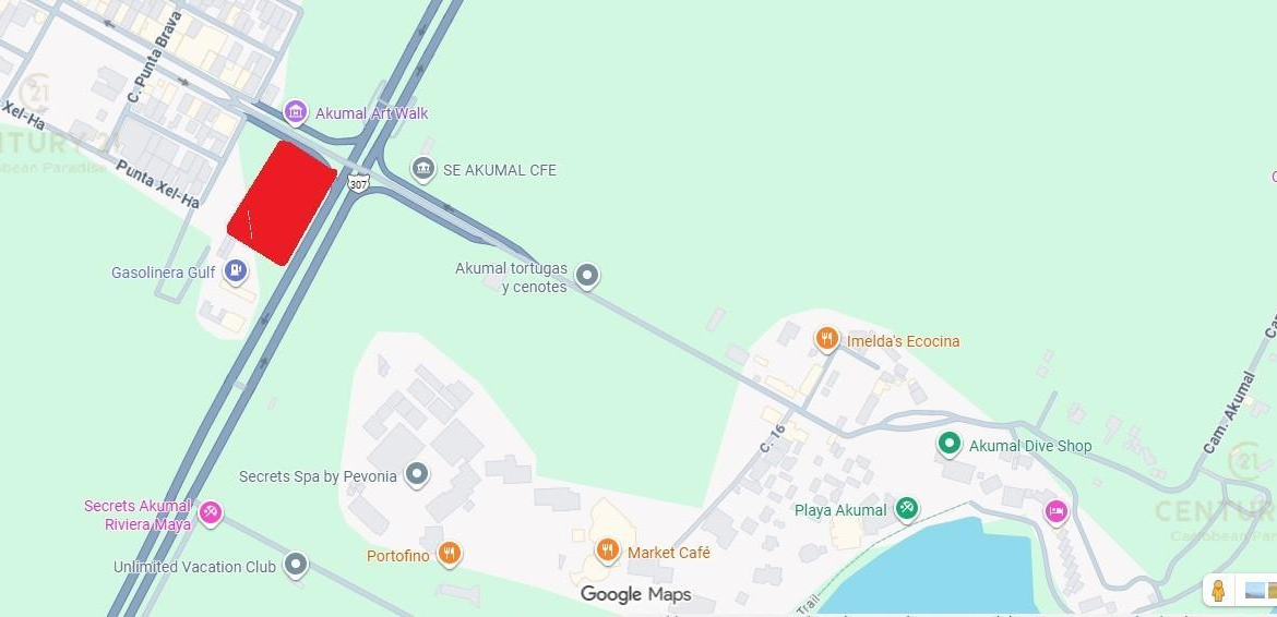 Terreno con uso de suelo mixto con muy buena ubicación, sobre la carretera federal en el pueblo Akumal (en el cruzamiento). Tiene 93 m de frente, sobre la misma carretera y 45m de fondo, en la esquina donde esta ubicado el puente de Pueblo Akumal (son 305 pies sobre la Carretera y 150 pies de fondo. Total de 45,600 pies cuadrados).
