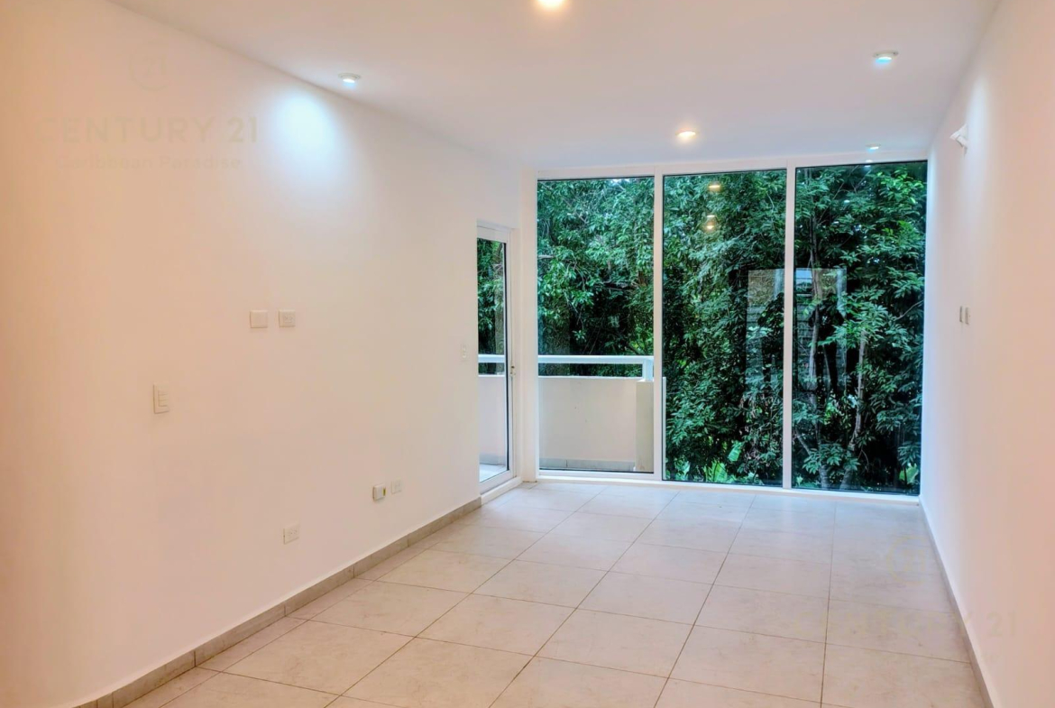 Estancia amplia con ventanal de vidrio en toda la pared con vista a jardines y alberca común.