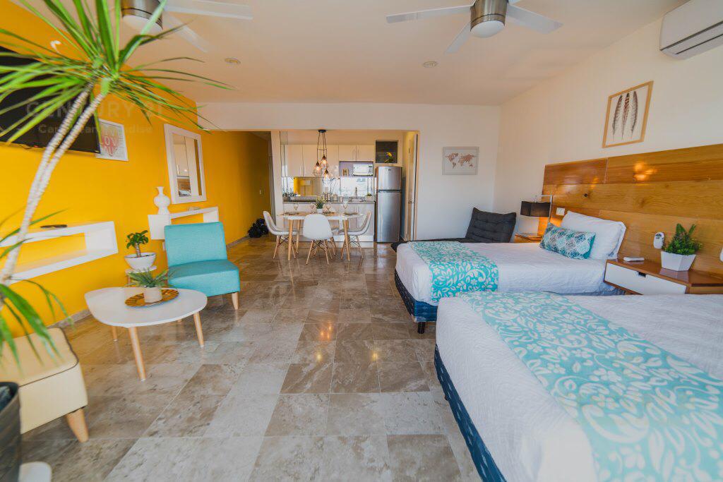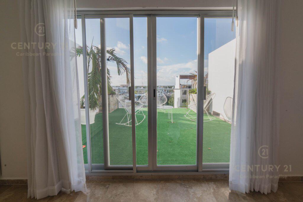 Acceso directo a la área común con Solarium y alberca, vista estupenda al mar del Caribe!