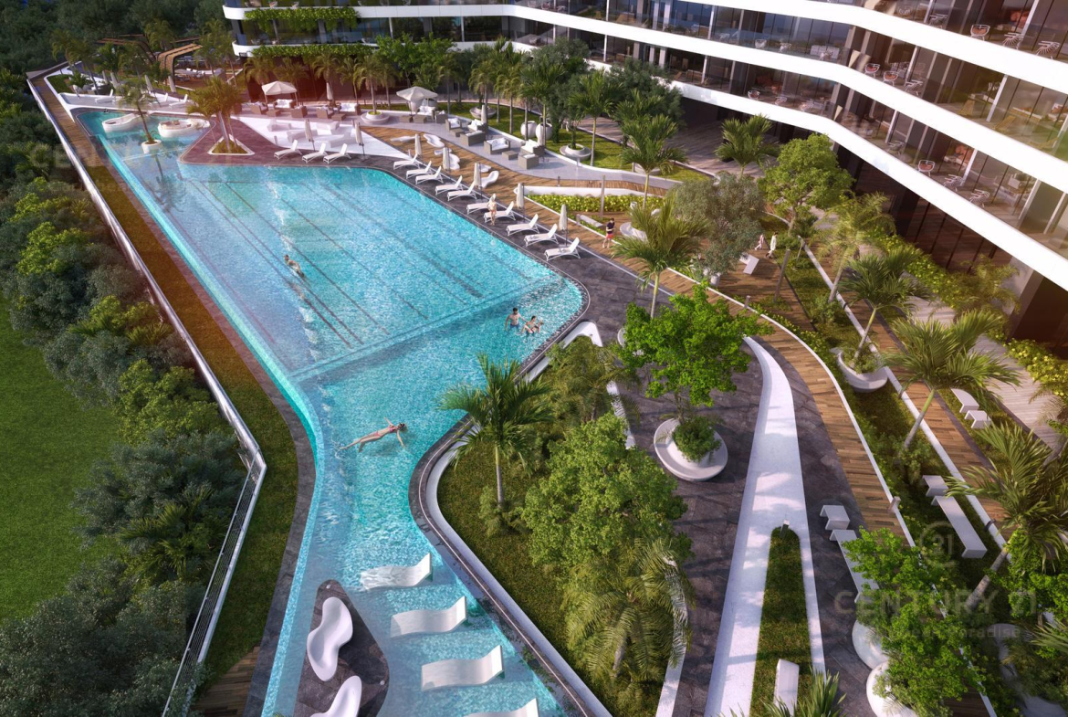 Departamento accesible con diseño eficiente, sustentable y funcional únicos en Puerto Cancún. Cada departamento tiene acceso directo desde el elevador, cuentan con elevador y entrada independiente de servicio. Equipados con cocina multifuncional y área de lavado de alta eficiencia en agua y energía. La ventilación cruzada natural ayuda a mantener espacios frescos sin consumo de energía.