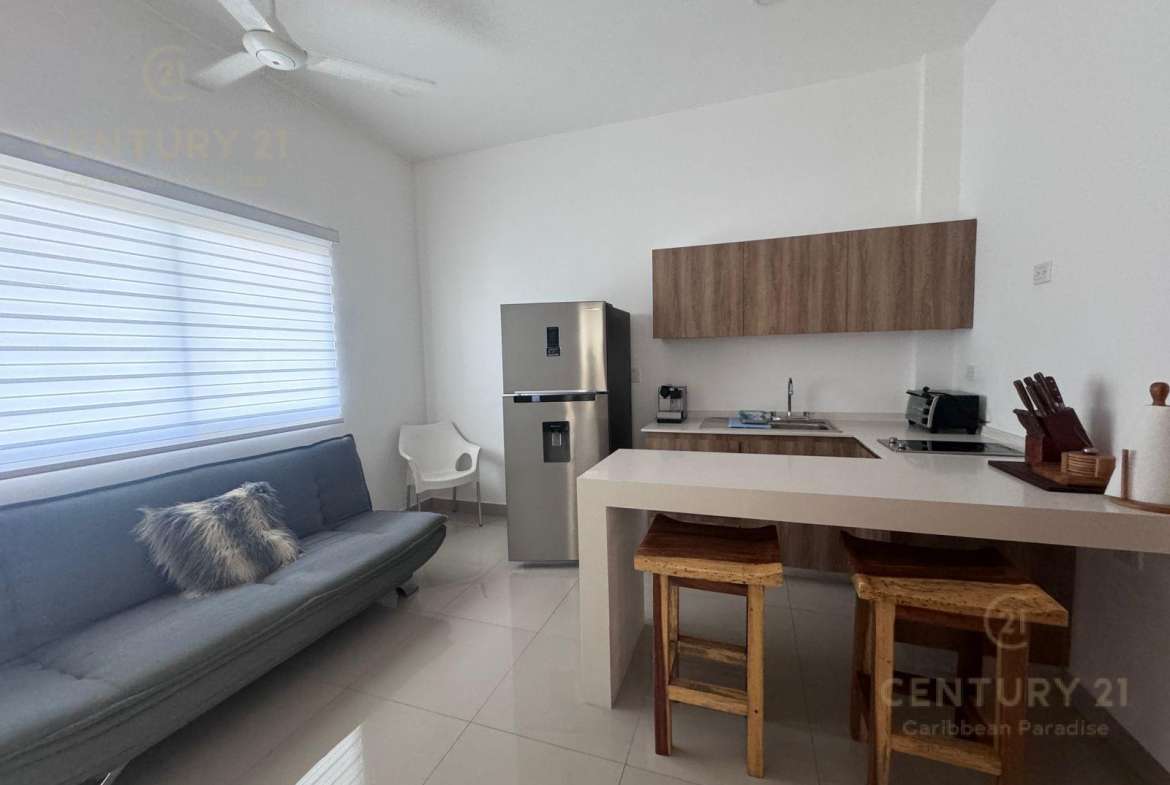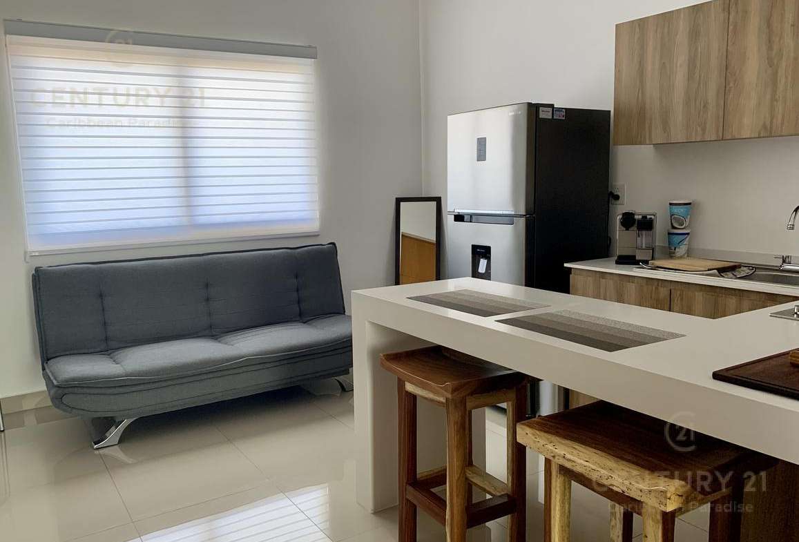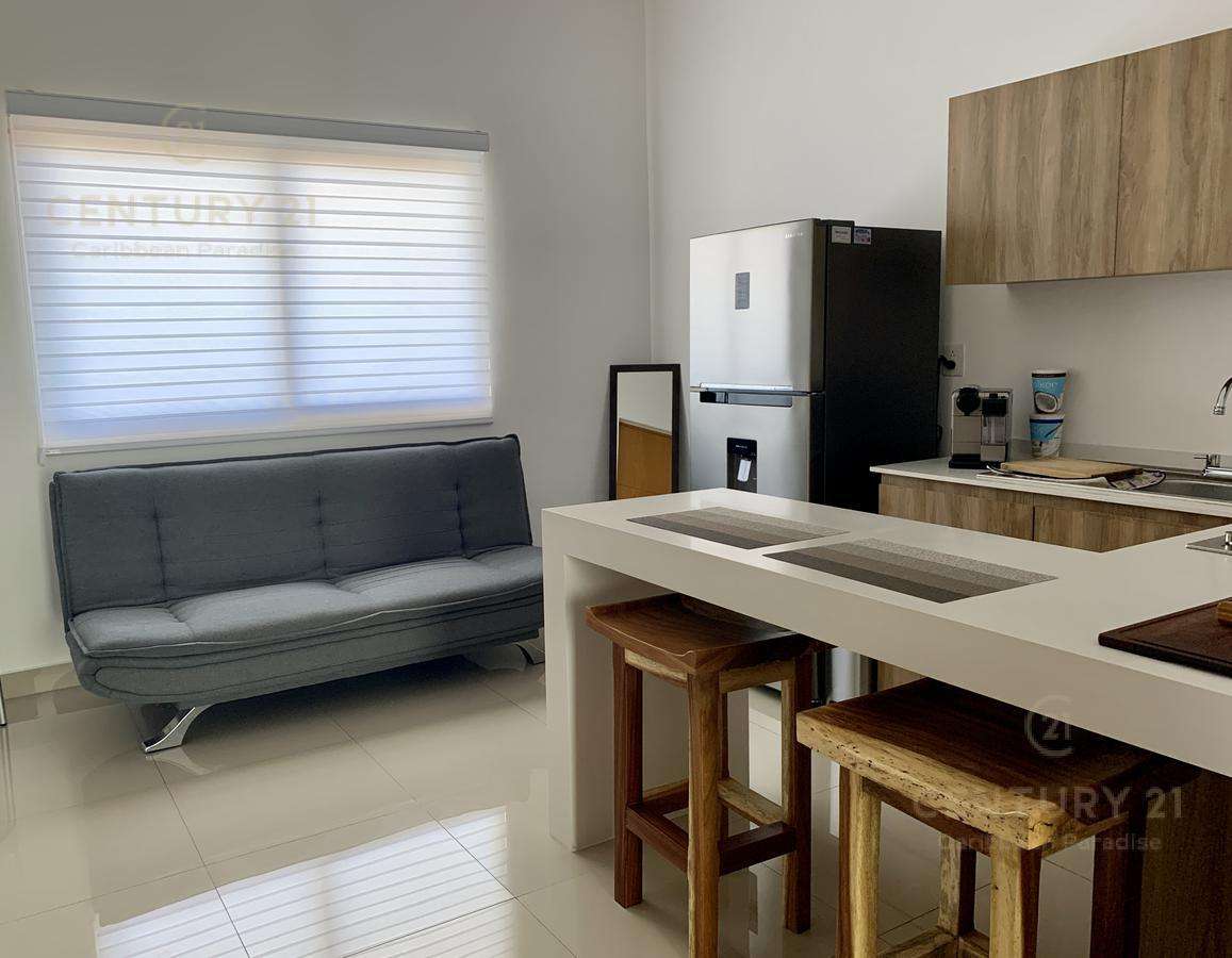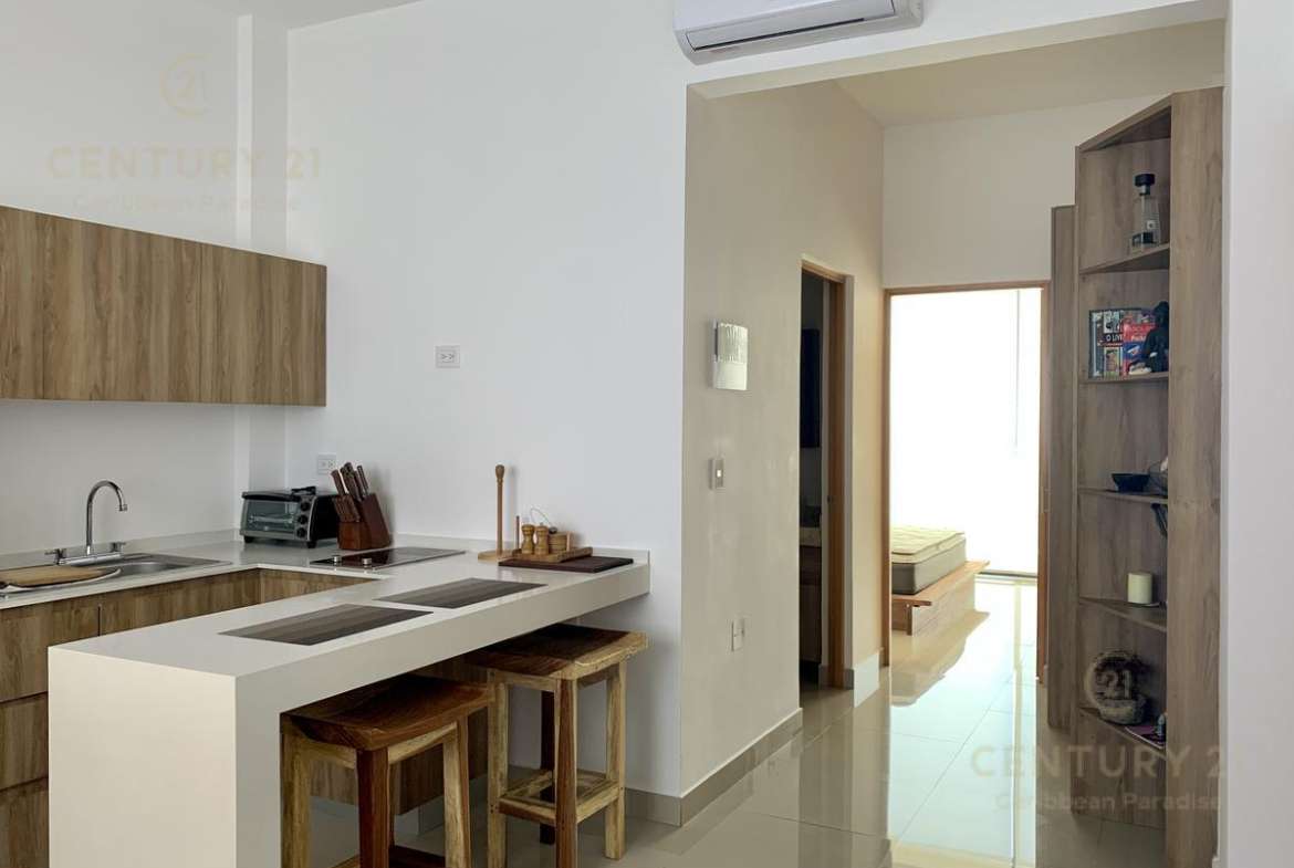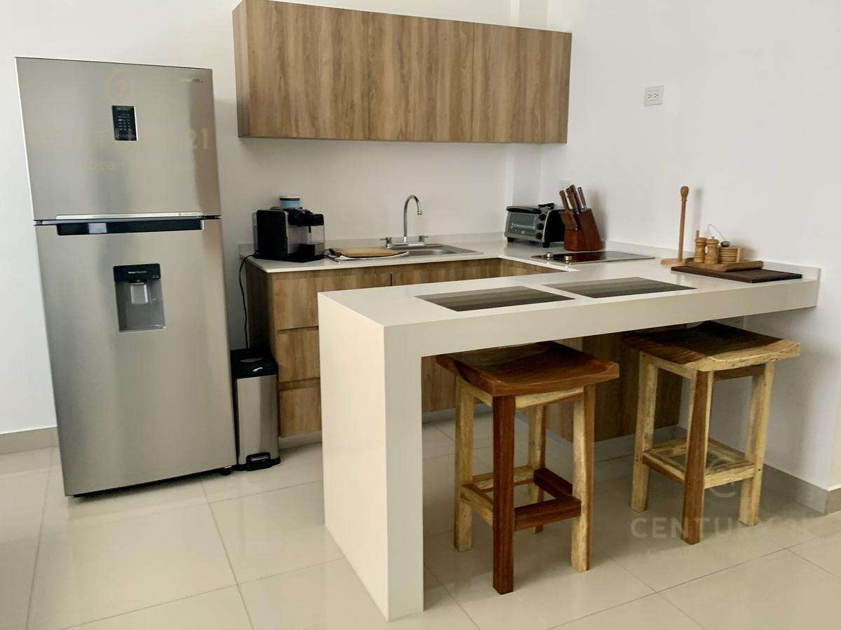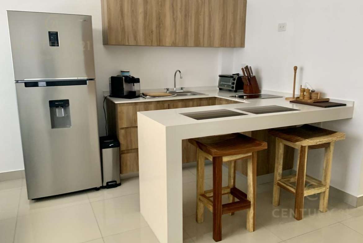 La propiedad es un espacio departamento amueblado con espacio de sala con sofácama, cocina integral con cubierta de cuarzo blanco; se encuentra equipada con todo lo que necesitas: cafetera nespresso, horno eléctrico, parilla eléctrica de 2 quemadores marca teka, refrigerador samsung y una barra de desayunadora con bancas de madera.