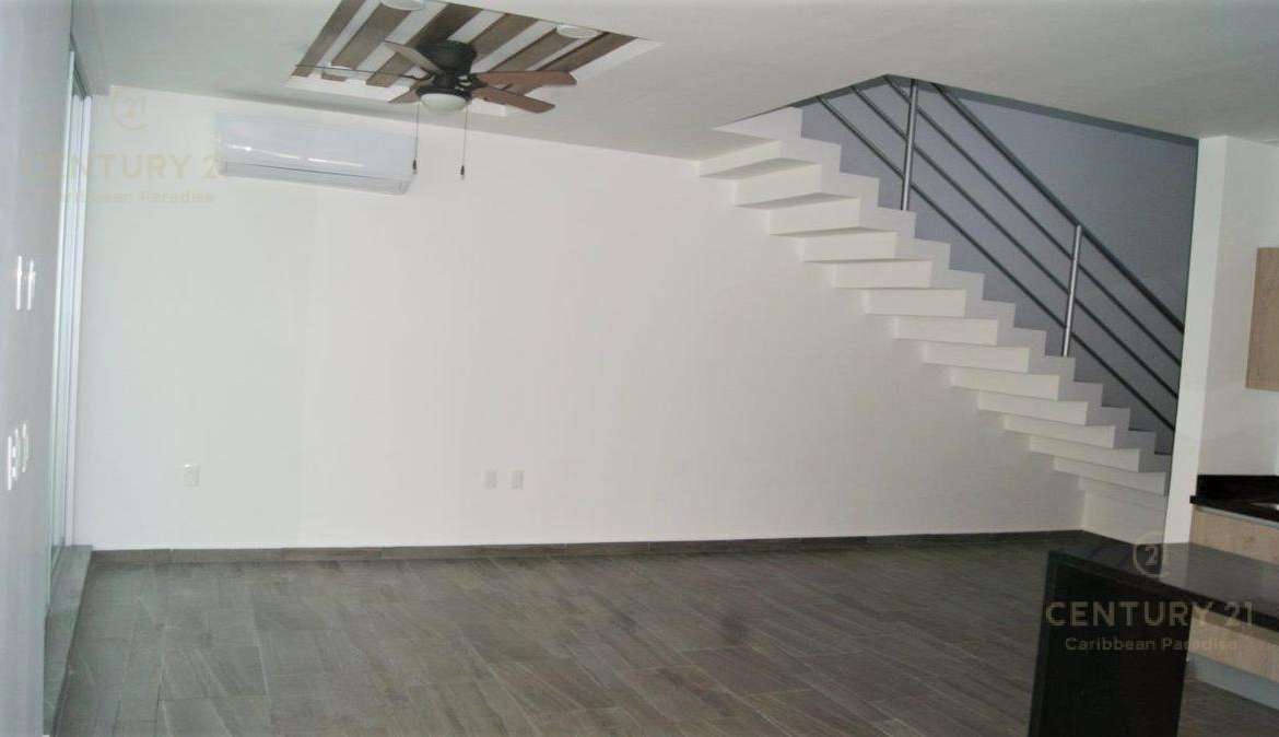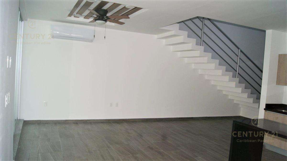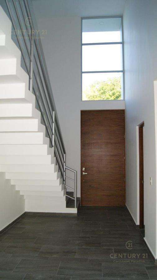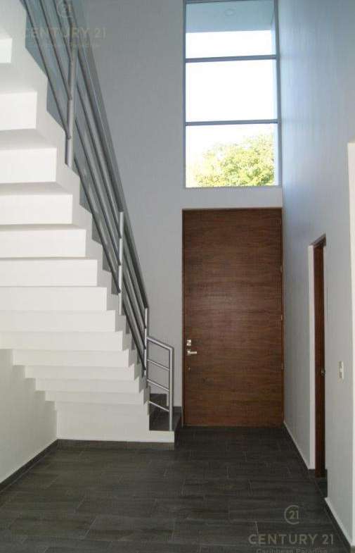 Una moderna escalera lleva al piso alto con 3 recamaras.