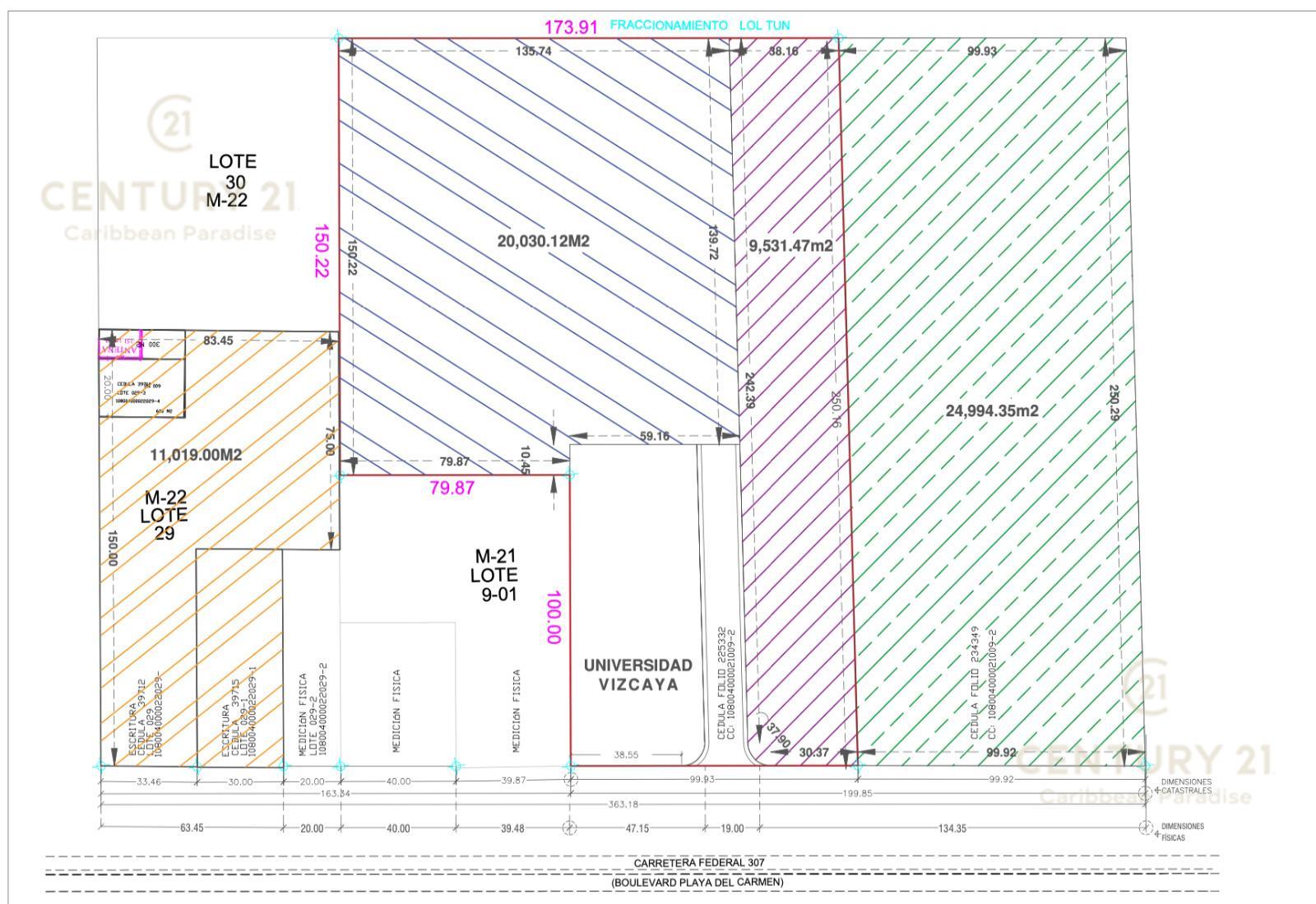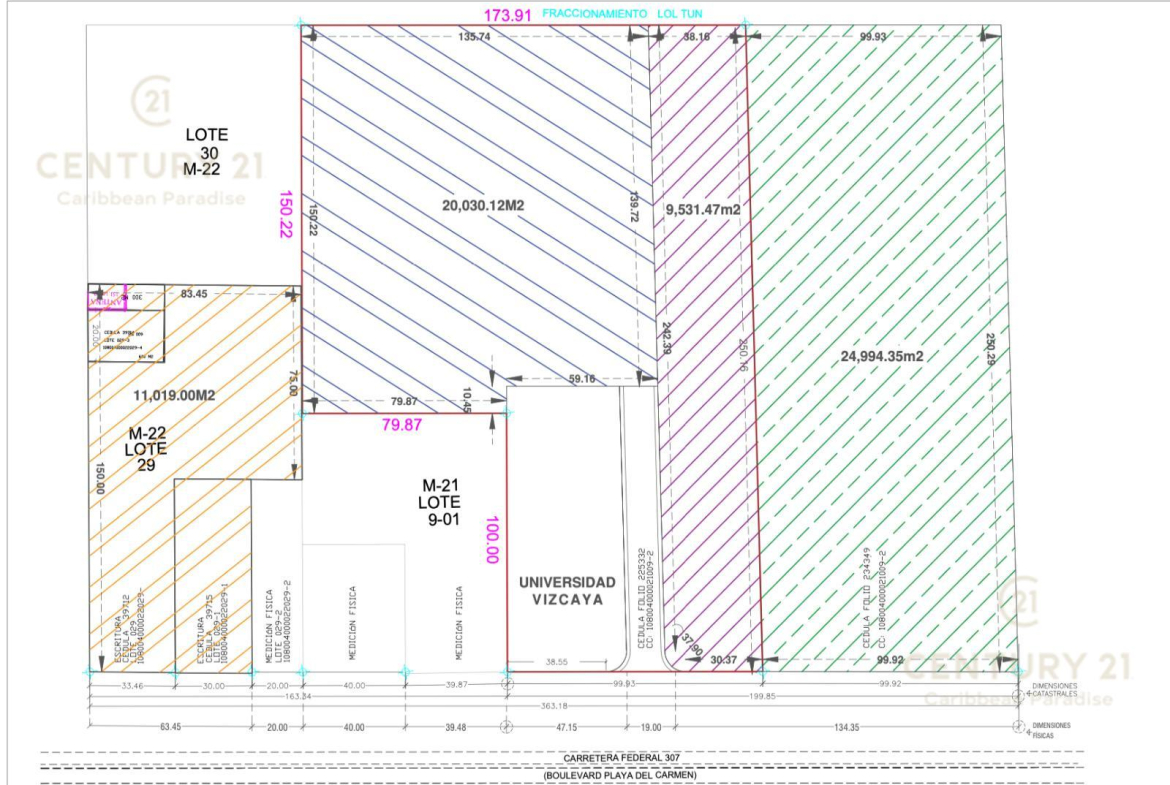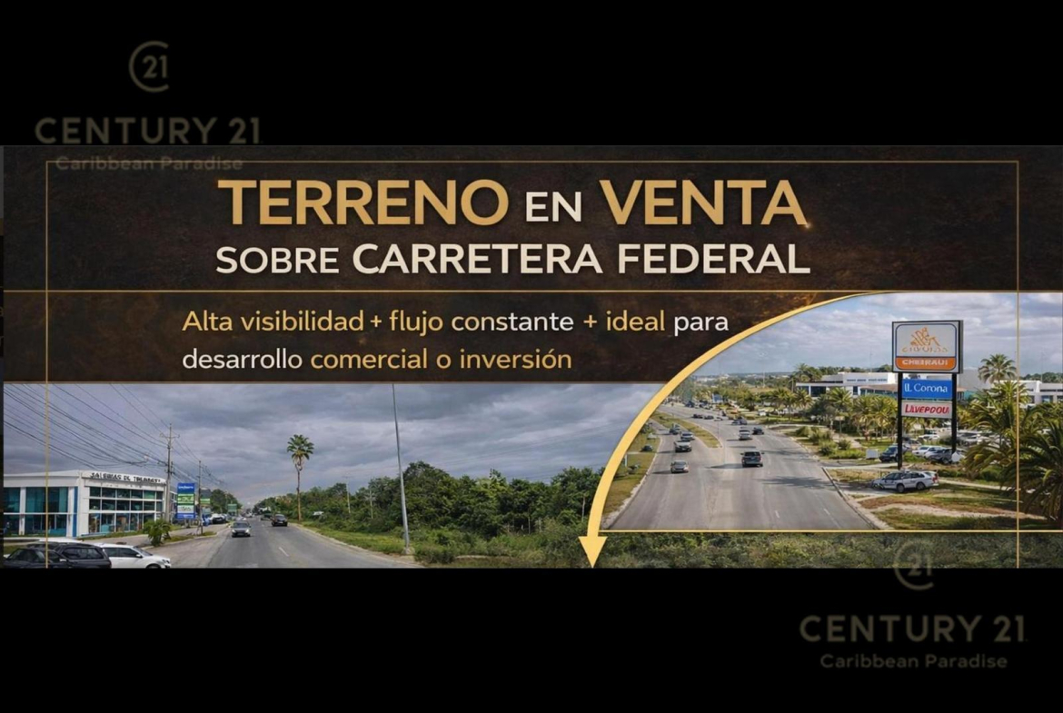 Este predio de 2.5 hectáreas (25,000 m²) se encuentra estratégicamente ubicado sobre la Carretera Federal 307, a la altura de Xcalacoco, en esquina, con 100 metros de frente a carretera y 250 metros de fondo, lo que le otorga una exposición comercial excepcional y alta visibilidad para cualquier desarrollo.