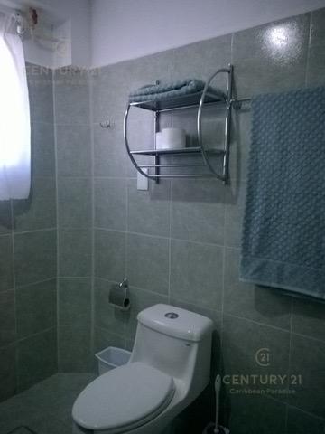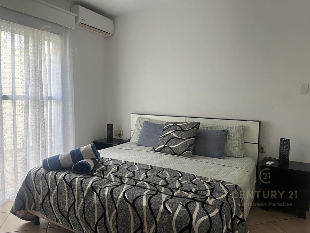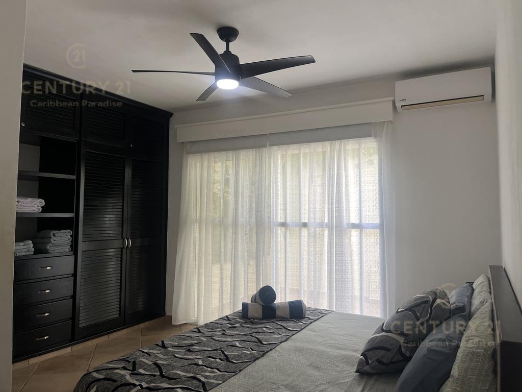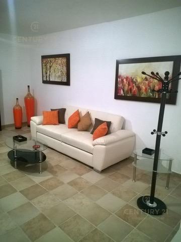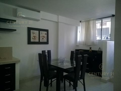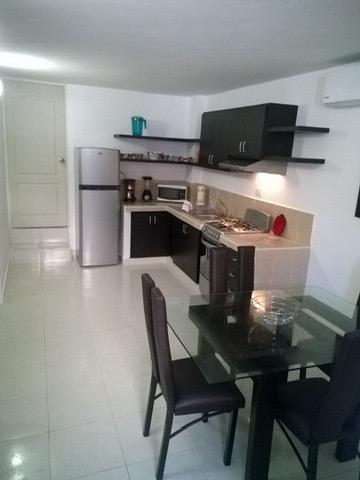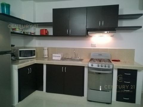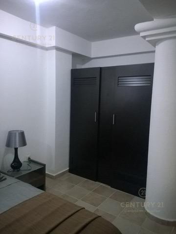 El primero departamento se encuentra en planta baja que cuenta con 2 recámaras, 2 baños, completamente amueblado, AC, sala, alberca en el centro del edificio. No cuenta con estacionamiento.