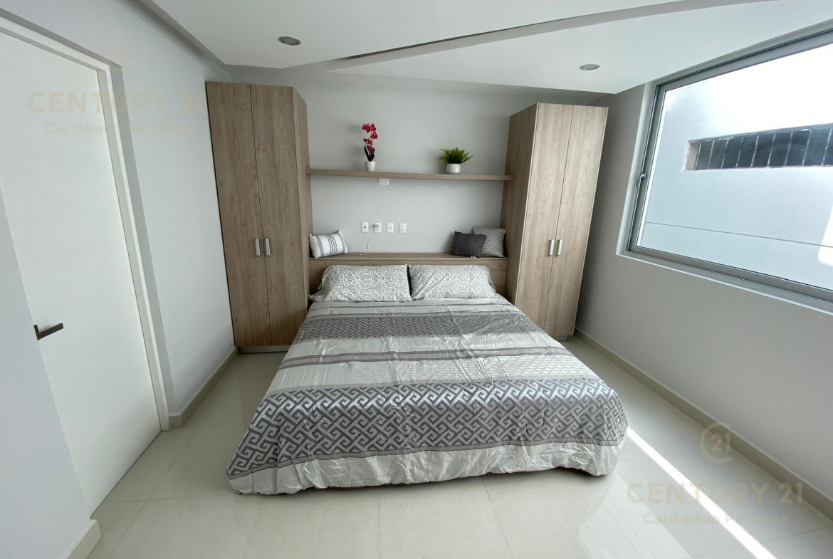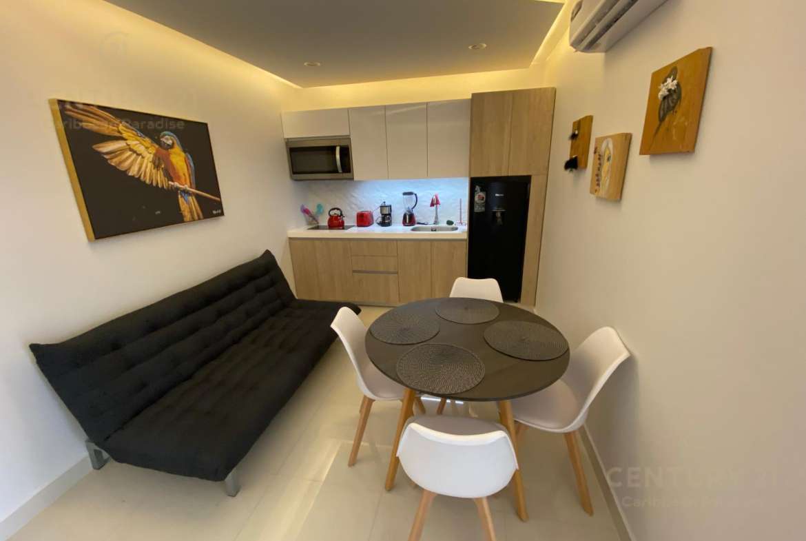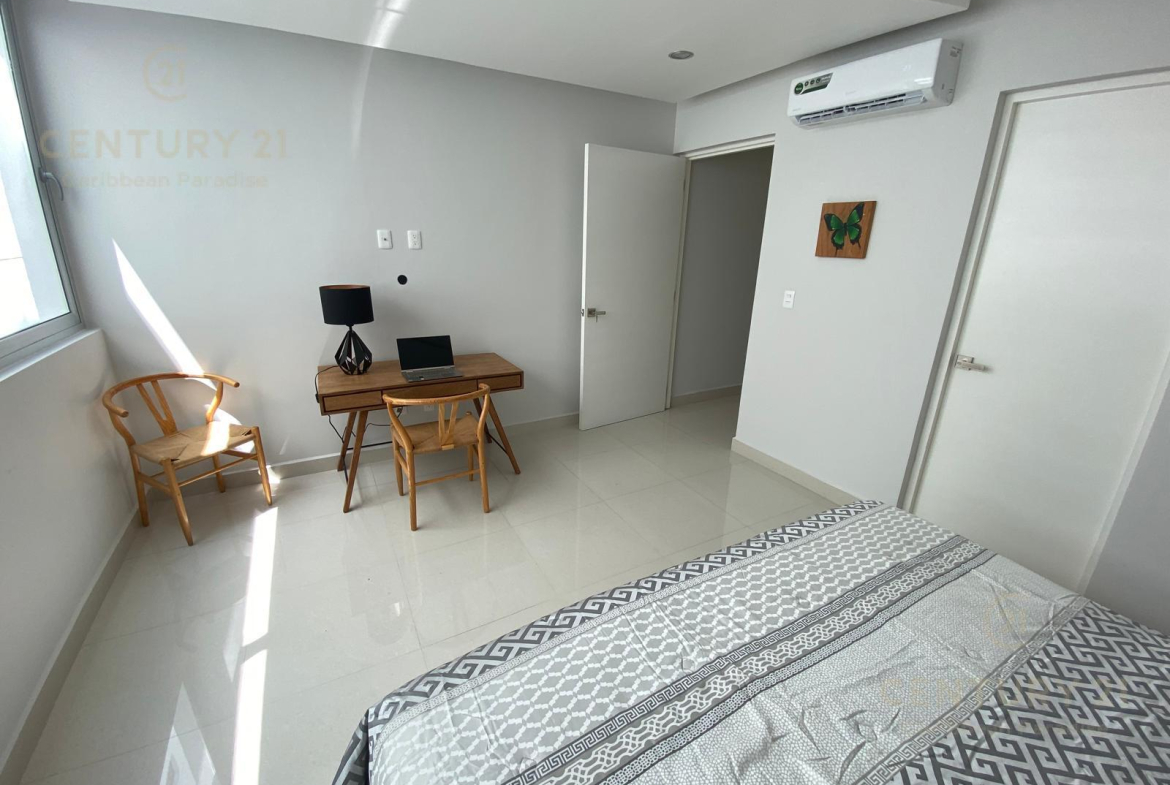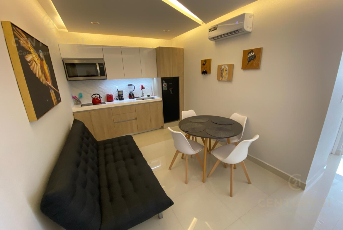El departamento se encuentra en la primera planta de 5. Se vende amueblado y equipado, con 1 recámara con cama King Size y aire acondicionado, 1 baño, Cocina y Sala